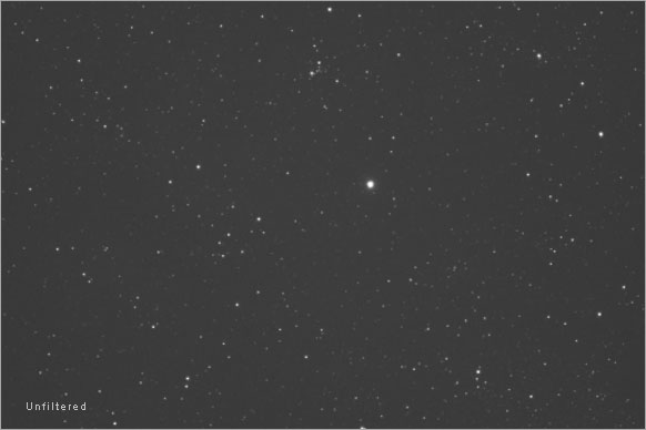 This large area of emission nebulosity surrounds Sadr, Gamma Cygni, the brightest star in this photo in the center of the frame, and the heart of the constellation of Cygnus the Swan. Numerous star clusters can also be found embedded in the nebulosity. The two sections of bright nebulosity to the left of Sadr are called the Butterfly Nebula, and have the catalog designation of IC 1318. The large area of dark nebulosity that separates the two halves of the Butterfly is LDN 889. The large patch of bright nebulosity at the top of the frame is designated as IC 1318a. The Crescent Nebula, NGC 6888, is at the lower right. This image was shot from my driveway in light-polluted suburban Philadelphia with a nearly full moon up. The special narrowband hydrogen-alpha filter that was used made this possible. In the mouse-over comparison below, we can see the tremendous difference that the filter makes. Because the narrowband 6nm hydrogen-alpha filter only passes light in a narrow window just 6 nanometers wide centered on 656.3 nanometers, the wavelength of the red hydrogen-alpha emission, it blocks out most of the other light in the sky from the Moon and from light pollution. This wouldn't work on a continuous spectrum object such as a reflection nebula, or a galaxy. The light from those objects is spread out across the entire spectrum. Because this light is red, it is only recorded in the red channel of a color image shot with a DSLR. Because we don't have any data in the green and blue channels, we can't produce a color image, therefore hydrogen-alpha narrowband images are monochrome. Because most stock DSLR cameras have a long-wavelength filter that filters out most of the hydrogen-alpha wavelength, it is advisable to use a modified DSLR with a narrowband hydrogen-alpha filter in a DSLR. Exposure Data