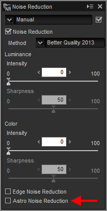 Being able to shoot at a low ISO with a higher dynamic range is very helpful with objects that have a large brightness range, such as the Orion nebula, M42, and the Andromeda galaxy as seen above. In the past, subjects like this had to be recorded with high-dynamic range techniques (HDR) where different exposures were composited together with masks to hold detail throughout the entire brightness range of the object. Note that the D810a's base ISO is 200 while the regular D810's base ISO is 64. Thermal Signal and NoiseDigital sensors are so sensitive that they also record signal that is created from electrons released by the thermal energy in the sensor substrate, even when it is not exposed to light. This is called "thermal signal" or "thermal current". Modern sensors are very good at on-sensor dark current suppression which removes the thermal signal at its source. At high ambient temperatures and long exposures used in deep-sky astrophotography, some of the "hot pixels" caused by thermal signal may remain. Hot pixels can be removed by Long Exposure Noise Reduction (LENR) in the camera when shooting. This is where the camera takes another exposure of the same length but with the shutter closed that records hot pixels from thermal signal and subtracts it from the real image. This processing in the camera removes the hot pixels, but at the cost of doubling the exposure time. It's better to use that time to collect more photons to improve the signal-to-noise ratio of your images, especially since you can remove hot pixels in post processing. Unless you are shooting at extremely high ambient temperatures with long exposures, you probably won't need the D810a's long-exposure noise reduction (LENR). Wei-Hao Wang measured the dark current in the D810a to be 0.25 e-/sec/pixel at 30 deg C. This is exceptionally low. However, the random noise associated with the thermal signal remains behind even with on-chip dark suppression technology, and even with LENR. The only way to deal with this noise is by improving the signal-to-noise ratio in the final image by increasing the amount of signal gathered - either with longer exposure in a single frame, or by averaging a series of shorter exposures as is commonly done for long-exposure deep-sky astrophotographs. Averaging a series of shorter exposures is generally superior because mathematically sophisticated combining algorithms can be used that improve the signal-to-noise ratio without sacrificing dynamic range and color in the brighter stars in the image. Black ClippingPrevious generation Nikon DSLR cameras were problematic for long-exposure astrophotography because in-camera noise suppression clipped the black point of the data in an image. While this reduced apparent noise in normal images, it caused problems when common astronomical calibration frames were used such as bias, flats and dark frames. According to Jim Kasson "Many cameras, including the Nikon D4 tested above, subtract the black point in the camera before writing the raw file, chopping off the half of the dark-field read noise that is negative. Even ones that don't do that, like the Nikon D810, at some ISOs, remove some of the left side of the histogram of the dark-field read noise. This kind of in-camera processing makes dark-field image measurement at best an imprecise, and at worst a misleading tool for estimating read noise." The D810a has not totally eliminated black clipping, but it should not be a problem as it is greatly reduced and correctly exposed images will not suffer any data loss. Camera Control SoftwareGuylain Rochon at BackYardNikon and Mike Unsold at Images Plus were kind enough to quickly supply a working beta version of their camera control programs to run the D810a through a laptop at the telescope during my long-exposure deep-sky imaging test sessions. Once you have advanced up the astrophotography learning curve to where you are shooting multiple exposures to improve the signal-to-noise ratio in your images, you will be autoguiding, and controlling your camera with a computer. This provides the added benefit of being able to dither your images. Dithering means moving the scope's exact pointing just a little bit between exposures. This helps tremendously in reducing pattern noise and satellite and plane trails with kappa-sigma combination methods. Nikon Control Pro 2 software will run the camera, but it is not included and costs an extra $150 and it will not interface with a mount for dithering. Image Processing SoftwareNikon Capture NX-D v1.2.1 image processing software is included with the camera and adds a nice astro noise reduction feature to remove hot pixels and color noise blotches as seen in the image comparison below. Nikon Capture NX-D can't be used for aligning and stacking multiple images to improve their signal-to-noise ratio however. But, hot pixel removal with astro noise reduction can be used.