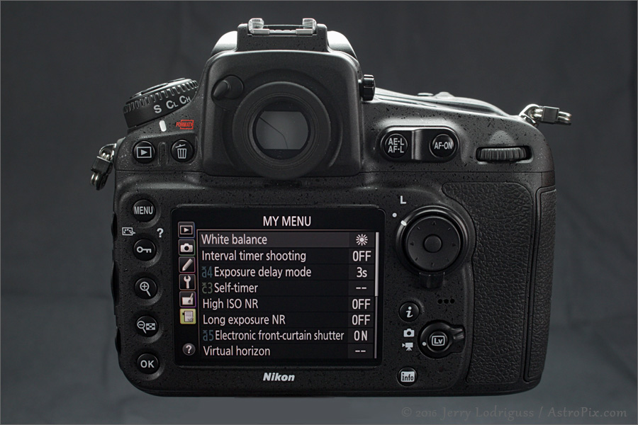 FeaturesThe electronic front-curtain shutter, which can be accessed under d5 in custom settings, eliminates vibrations from mirror slap and the mechanical shutter opening. It is available only in "Mup" mode (Mirror Lock Up) and must be used with M or M* exposure mode. An exposure delay of 1, 2, or 3 seconds can also be programmed. The D810a does not have built-in GPS, but it does have a built-in eyepiece cover so you can't ever lose it. One very nice feature of the D810a is that, like all other Nikon cameras which have been around since 1959, it uses the Nikon F lens mount. I used my 20-year-old Nikkor AIS manual-focus lenses with it. Like the D810, the D810a has no optical low-pass anti-aliasing (OLPA) filter. These filters were included in previous cameras to deal with moiré and false color. Moiré and false color are artifacts created when a pattern in the subject is near the resolution of the sensor. The OLPA filter dealt with these artifacts by slightly blurring the image. The image was then sharpened to deal with the blurring. Removal of the OLPA in the D810a can produce sharper images but requires more strict execution and optical quality. For daytime photography, this means that to achieve the increased resolution the camera must be mounted on a tripod and the shutter opened with a remote release with the mirror locked up to prevent vibrations that can reduce the resolution. A lens capable of actually producing the resolution the sensor is capable of must also be used and this is not trivial with today's high-resolution sensors. For long exposure astronomical images, the atmospheric seeing is usually the limiting factor in the resolution of the system.