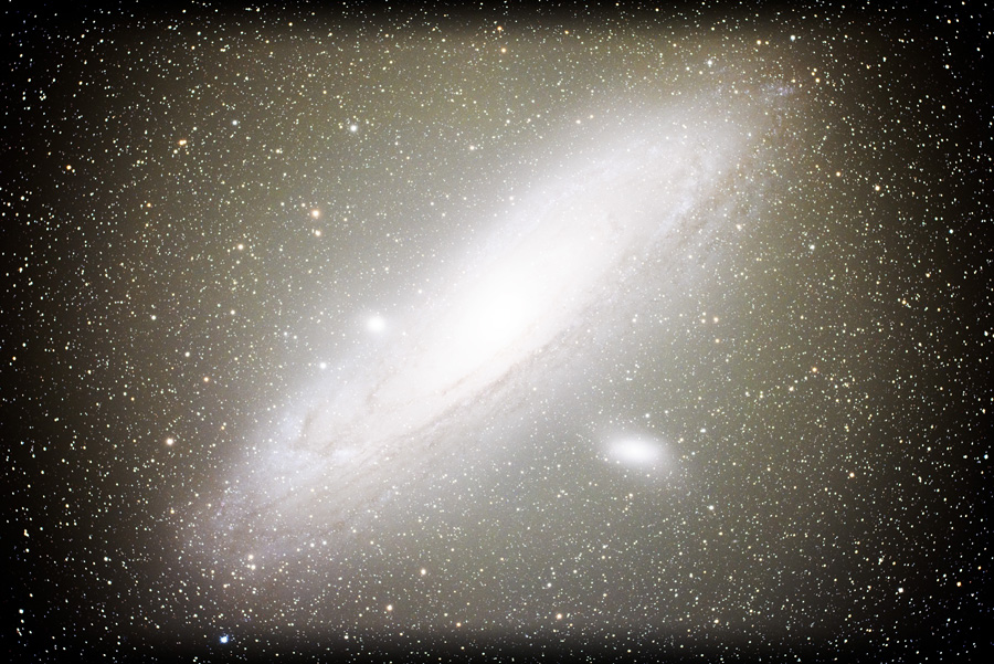 Vignetting is light falloff in the corners of an image. There are three types of vignetting: mechanical, optical, and natural. Mechanical vignetting comes from physical objects that actually block light, such as a dew shield on a telescope that is too long, or lens shade on a lens that is too small. Depending on the type of the optical system in a telescope and the shape of the light cone produced by it, the mirror box inside of a DSLR can also cause some shadowing. This is seen in the D810a when used with the steep light cone produced by a refractor used with a focal reducer. This type of shadowing is usually not visible in normal images, but can show up in astronomical images where the contrast is greatly increased to make faint details visible. This is not really a design flaw or criticism of the D810a, it is just something that happens sometimes. Luckily, it can be corrected by the use of flat-field frames. Optical vignetting is caused by the complex arrangement of optical elements in a camera lens where front elements can block part of the off-axis light reaching rear elements. This type of vignetting in common in camera lenses when they are used wide open and can be improved by stopping the lens down. Natural vignetting is light falloff in the corners of the frame due to geometrical reasons and the angle at which light reaches the sensor. It can not be fixed by stopping down the lens, but it can be improved by using flat-field calibration frames. Nikon's NX-D image processing software, which comes with the D810a, has a correction function that will help reduce vignetting. Unfortunately, with any type of vignetting, there is a reduction of signal in the affected area causing a reduction in the signal-to-noise ratio in that area. This loss of signal-to-noise can not be corrected with flat-field frames or with software processing, although these methods do improve the cosmetic appearance of an image. Color Balance