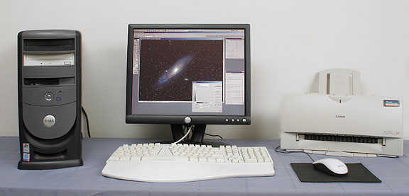 LCD Monitor - You will need a good LCD monitor to view and process your images on. Look for a graphics monitor with an IPS display. Hardly anyone is making CRT monitors anymore, so you can pretty much forget about finding one. Monitor Calibration Hardware - Although you can calibrate your monitor with software, a hardware monitor calibration device works much better and is more accurate. RAM (Random Access Memory) - Like money, you can never have enough RAM. RAM can be obtained really inexpensively from a very reputable manufacturer like Crucial. They have a great web page where they find out exactly which computer you have and recommend the exact kind of RAM that you need. I recommend 2 Gigabytes of RAM at a minimum. Compact Flash Card Reader - Your camera can be hooked up to the computer via the USB cable and you can download images like that, but why subject your expensive DSLR camera to that additional wear and tear? You can use an inexpensive card reader such to download images from your memory cards after a night's astrophotography session. CD or DVD Writer - A lot of data is produced when you shoot astrophotos with a DSLR camera. You really need to archive them permanently on some type of optical media. If you save them on your hard drive, and you have a hard drive crash, or lightening hits your home, you may lose all of your images. I write a CD-R or DVD on a high quality media like Mitsui or Taiyo Yuden after each nights astrophotography session. You should be able to pick up a good CD/DVD writer these days for a very inexpensive price. Printer - A desktop inkjet printer can be used to print your astrophotos. Epson and Canon make some very good color printers. Or, believe it or not, you can save $200 to $500 and have your images printed by Adorama Pix. For extremely reasonable prices, they produce excellent prints. They also offer mounting and framing. *Prices and availability of all items are subject to change without notice by the vendors and manufacturers. |