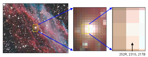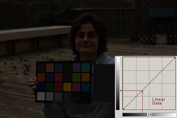 Color images are actually made up of three individual channels of black and white information, one each for red, green and blue. Because of the way the eye and brain sense color, all of the colors of the rainbow can be re-created with these three primary colors. Although the digital camera can record 12 bits (4096 steps), or 14 bits (16,384 steps) of brightness information, most output devices can only display 8 bits or 256 steps per color channel. The original 12-bit (212 = 4096), or 14-bit (214 = 16,384) input data must be converted to 8-bits (28 = 256) for output. In the above example, the indicated pixel has a brightness level of 252 in the red channel, 231 in the green channel, and 217 in the blue channel. Each color's brightness can range from 0 to 255, for 256 total steps in each color channel when it is displayed on a computer monitor, or output to a desktop printer. Zero indicates pure black, and 255 indicates pure white. 256 colors each of red, green and blue may not seem like a lot, but actually it is a huge number because 256 x 256 x 256 = more then 16 million individual colors. Tonal Sampling Light and tones in the world are continuous. After sunset on a clear day the sky in the west varies from bright near the horizon to darker blue overhead. These shades of blue vary continuously. They transition smoothly from light to dark. Digital cameras measure light and break its continuously varying tones into discrete steps that can be represented by numbers (digits). They digitize the image. Due to the way our visual system works, if we divide the continuous tones into a sufficient number of small discrete steps we can fool the eye into thinking it is continuous tone even though it is not. In the above examples, we can see the effect of a different number of tones when we sample from black to white. We can clearly differentiate a small number of tones as not being continuous. But when the number increases, somewhere around 128 steps, they appear to be continuous to our perception. Dynamic Range and Bit Depth Dynamic range is the range of brightness from light to dark in which detail can be recorded. It is defined as the number of electrons that can be held in a well divided by the noise present. Bit depth is the number of steps that the dynamic range is broken into. Bit depth does not define dynamic range. A given dynamic range can be represented by any bit depth, that is, it can be broken into any number of steps. More bit depth does not mean more dynamic range. Computers and Numbers Because computers are very powerful at manipulating numbers, we can perform different operations on these numbers quickly and easily. For instance, contrast is defined as the difference in brightness between adjacent pixels. For there to be contrast, there must be a difference to start with, so one pixel will be lighter and one pixel will be darker. We can very easily increase the contrast by simply adding a number to the brightness value of the lighter pixel, and subtracting a number from the brightness value of the darker pixel. Color in an image is represented by the brightness value of a pixel in each of three color channels - red, green and blue - that constitute the color information. We can just as easily change the color of a pixel, or group of pixels, by just changing the numbers. We can perform other tricks too, such as increasing the apparent sharpness of an image by increasing the contrast of the edge boundaries of objects in an image with a process called unsharp masking. Having the image represented by numbers allows us to have a lot of control over it. And, because the image is a set of numbers, it can be exactly duplicated any number of times without any loss of quality. Linear vs Non-Linear Data The recording response of a digital sensor is proportional to the number of photons that hit it. The response is linear. Unlike film, digital sensors record twice the signal when twice the number of photons hit it. Digital sensors also do not suffer from reciprocity failure like most films. Reciprocity failure meant that film became less sensitive under low levels of light. The data produced by the CMOS sensor in a DSLR camera that is written to the raw file is linear. The linear data will usually look very dark and low in contrast compared to a normal photograph (see the image below). Human visual perception of brightness is more similar to a logarithmic curve than a linear curve. Other human senses, such as hearing, and even taste, are also logarithmic. This means that we are better at sensing differences at the low end of the perceptual scale than we are at the high end. For example, we can very easily tell the difference between a one-pound weight and a two-pound weight when we pick them up. But we have a great amount of difficulty telling the difference between a 100-pound weight and a 101-pound weight. Yet the difference is the same, one pound. Normal photographs produced on film are recorded in a non-linear manner that is similar to the way human vision works. That's why we can hold a transparency (slide) image up to the light and it looks like a reasonable representation of the original scene without any further modifications. Because the human visual perceptual system does not work in a linear manner, a non-linear curve must be applied to "stretch" the linear data from a DSLR camera to make the tonality of a photo match the way our visual system works. These non-linear adjustments are done by software inside the camera if the image is written to a JPEG file. If a raw file is saved in the camera, these non-linear adjustments are done in software later when the data is opened in an image processing program. In the image examples seen above, a screen shot of Photoshop's Curves dialog has been included in the image so we can see a comparison between linear data and the same data with a non-linear curve applied to it. The curve in the dark image is linear, it is a straight line. The curve 