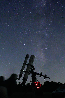 Our eyes also sample the world in a way that can be thought of as a "time exposure", usually on a relatively short basis of a few tenths of a second when the light levels are high as in the daytime. Under low light conditions, the eye's exposure, or integration time can increase to several seconds. This is why we can see more details through a telescope if we stare at a faint object for a period of time. The eye is a relatively sensitive detector. It can detect a single photon, but this information is not sent along to the brain because it does not exceed the minimum signal-to-noise ratio threshold of the noise-filtering circuitry in the visual system. It requires several photons for a detection to be sent to the brain. A digital camera is almost as sensitive as the eye, and both are much more sensitive than film, which requires many photons for a detection. It is the time sampling with long exposures that really makes the magic of digital astrophotography possible. A digital sensor's true power comes from its ability to integrate, or collect, photons over much longer time periods than the eye. This is why we can record details in long exposures that are invisible to the eye, even through a large telescope.
