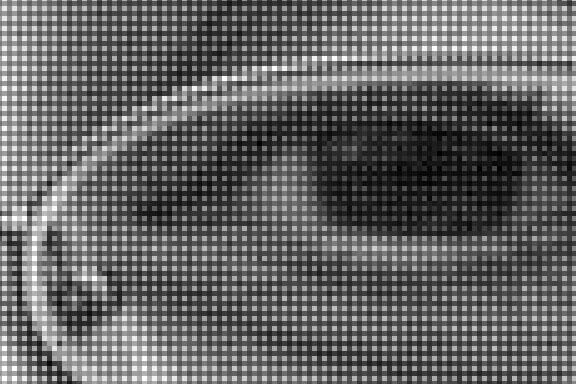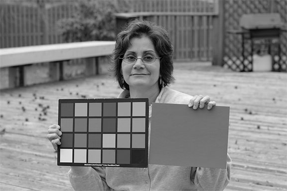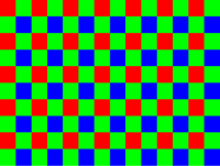 A Bayer array consists of a grid, or mosaic, where each row is made of alternating red and green, or blue and green filter colors. This produces a final mosaic with twice as many green pixels as either red or blue. Bayer found that because human perception was more sensitive to luminance (brightness) information in the green portion of the spectrum, increased luminance resolution by using more green pixels meant more perceived sharpness in the final image. Color for each individual pixel is created by examining the color of the pixels around it and then processing this information through a sophisticated mathematical algorithm. As you can see in the example at the top of this page, the Bayer interpolation algorithm does a remarkably good job of creating accurate color from the black and white original. Bayer Array Resolution In re-constructing the color present in the original scene, the red, green and blue filtered black and white information from each individual pixel is compared to the information from its neighbors. Because color information from all three channels is present in each 4x4 pixel group, color for each individual pixel can be created through interpolation. The red, green and blue filters used over the individual pixels also have large regions of overlap in their spectral sensitivity. For example, some red and green light also gets into the blue pixel information. This means that the luminance resolution from a Bayer sensor array is correlated almost 1:1 with the pixel resolution, but the color information has less resolution. This is usually not a problem as human perception is less sensitive to color resolution.