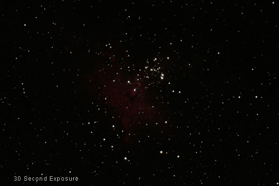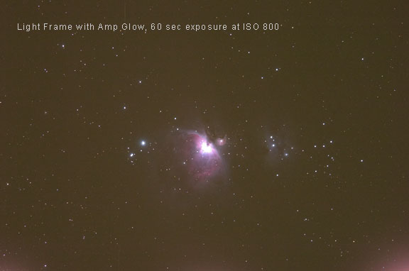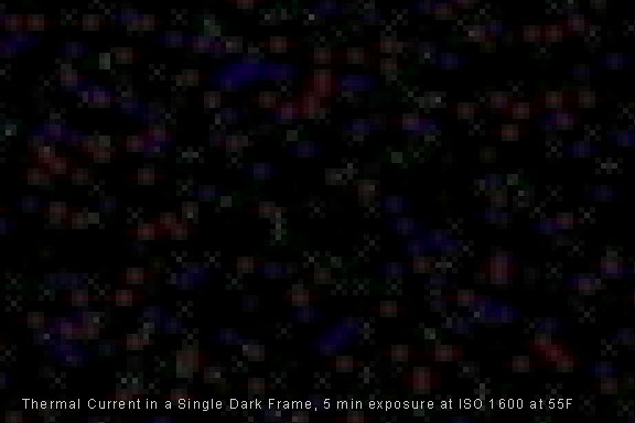 Object Signal - Electrons created by the sensor in response to photons from the actual astronomical object. The object signal grows linearly with exposure time. There is a lot of light, and a lot to photons, for normal daytime photographs, so exposure times are short. For deep-sky astronomical objects the opposite is usually true. Light intensity from these types of objects is very faint. This means we need to use long exposures to record the scarce photons from them. The more photons we collect, the better we can see the object and separate it from the noise that is present in all digital cameras. The photons from the object create the signal that we are interested in. It is recorded along with various other signals that are not as interesting, along with noise. Increasing the signal to noise ratio, and removing signals that we are not interested in, are the ways to improve our pictures. Normally the way to increase the signal is to simply collect more photons. This is done by increasing the exposure. In the example images above, we can see the effect of a 30 second exposure and a 300 second exposure. The 300 second exposure has recorded 10 times as many photons and the object is much more easily visible because there is more signal. Sky Signal - The sky signal comes from electrons created in the sensor in response to photons from the sky that get detected along with the object photons. Many of these photons originate in the sky "foreground", which is basically the Earth's lower and upper atmosphere. The lower atmosphere can contain particulate matter and moisture that is illuminated by man-made light pollution. The upper atmosphere contains light sources such as the atmospheric airglow and other sources such as auroral activity. Airglow is the brightest component and is caused by oxygen atoms glowing in the upper atmosphere which are excited by solar ultraviolet radiation. Airglow gets worse at solar maximum. There is also a blue component to the sky foreground signal that is caused by starlight scattered in the atmosphere which has the same cause as the blue daytime sky (scattered light from the Sun). Sky signal also grows linearly with exposure time. Thermal Signal (Dark Current) - When photons of light from the sky strike the CMOS sensor in our cameras, electrons are produced that are stored and later counted. Other electrons, called "thermal signal" are also generated in the silicon substrate material by heat. The number of these non-sky electrons increases as the temperature goes up. Sometimes these heat-generated electrons can get into a photo-site where they are counted along with electrons generated by the photons from the sky. This happens even when the sensor is not exposed to light, hence the name "dark current". This signal is more properly called thermal signal because it is present in all frames, light and dark. Thermal signal grows linearly with exposure time. Thermal signal is not noise, even though it looks like it is. Because it is signal, it does not vary randomly, but repeats consistently. The thermal signal, or dark current, can be seen in the example above as hot pixels, clumps of hot pixels, and larger areas of red, green and blue splotches. This thermal signal is present in this exact form in all long exposures, it only varies in intensity depending on the temperature, length of exposure and ISO. Thermal signal is repeatable for images taken with the same exposure length and temperature. It is related to the temperature, generally doubling for each increase of six to ten degrees Celsius. This is why astronomical-dedicated CCD cameras have built-in coolers. DSLRs are usually not cooled, but thermal signal will be less at lower ambient temperatures. Thermal signal is linearly related to the length of the exposure, with a doubling of the exposure resulting in a doubling of the thermal signal. Each individual pixel in the sensor has its own thermal signal which stays constant for that pixel at a given exposure and temperature. However the amount of thermal signal varies from pixel to pixel, just as the sensitivity to light varies from pixel to pixel. This constancy from pixel to pixel results in what is called "fixed pattern noise". It can be seen as a snow-like appearance in an image, and as clumps of colored red, green and blue pixels. Some pixels have dark current that is very high. These are called "hot pixels" and show up as white pixels in the image. Other pixels are dead and do not respond to light at all. These are called "dead pixels". They show up as black pixels in the image All of these manifestations of thermal signal can be calibrated out by subtracting a "dark frame" (an exposure where no light reaches the sensor) taken at the same temperature and exposure length as the light frame. Bias (Offset) Signal - The bias signal comes from electrons from current that is applied to the sensor to get it charged and ready to collect electrons generated by the detection of photons from the sky. Bias adds an offset or pedestal to the voltage presented to the Analog/Digital converter. The bias signal is constant in every frame taken at the same temperature. It is essentially a picture of the constant voltage offset, the amplifier readout noise, and camera electronic noise. Cosmic Rays - Real detections of high-energy particles from the sky that appear as hot pixels or short streaks in the image. Amp Glow - Amp glow is a red glow that can be found usually on one edge or corner of the frame for long exposures. It originates from electrons in the metal-oxide semiconductor field-effect transistors (MOSFET) that are in the readout amplifier. Amp glow is not caused by heat, it is caused by electroluminescence. It can be controlled by turning off the amplifier during the exposure, as is done in most of the recent models of DSLR cameras. For cameras that do not turn off the amplifier, amp glow can be reduced by the subtraction of a dark frame. However, if the exposure is l