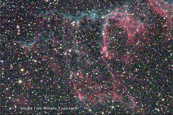 Improve the Signal-to-Noise Ratio With More Exposure Here two images can be compared to see the effects of additional exposure time. One is a single five-minute exposure. The other is an average of 25 exposures for a total of 175 minutes of exposure time. Both were shot at ISO 1600 at f/6. The single five-minute exposure has had its brightness and contrast increased to make it match the 175-minute stacked image. It is easy to see the incredible difference that more exposure makes. More exposure gathers more photons, increasing the signal-to-noise ratio, revealing more stars and fainter nebulosity. Remove Thermal Current Signal by Subtracting a Master Dark Frame The image above is a composite of 9 five-minute exposures at ISO 1600 and it shows a significant amount of thermal current signal generated by heat in the sensor's silicon substrate, as well as bias signal. Both were removed by subtracting a master dark frame composed of 9 five-minute individual dark frames. Sky Background Signal Subtracted Out, Vignetting Corrected This example shows how the skyfog can be subtracted out, and vignetting and light-pollution gradients corrected with the proper image-processing software filtering techniques. The sky background was subtracted by adjusting the black point in Photoshop's Levels, and vignetting and light-pollution gradients were removed with an application of the GradientXTerminator filter. The uneven dark areas remaining in the image are actual dark nebulae in space. Dealing with Noise The number one rule to beat noise is to gather more signal. Noise is always present in the images that we take. Photon noise, dark noise and readout noise can never be removed from an image. However by increasing the number of photons gathered, we can increase the signal-to-noise ratio and improve the image. This is done by shooting the longest exposures as possible for a given set of conditions and then combining as many of these long exposures as possible. With short exposures of dim subjects, not many photons are collected, and dark current noise and readout noise dominate the image. If a number of short exposures are added or averaged together, the dark noise and readout noise will add together. This is why it is critical to increase the exposure to where photon noise dominates. Photon noise can be dealt with by increasing the signal-to-noise ratio by gathering more photons. Dealing with Unwanted Signals with Calibration Frames