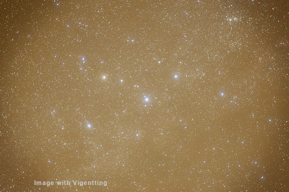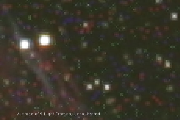 In-Camera Dark Frame Subtraction Some cameras, such as Nikon and Canon, offer in-camera noise reduction as a custom function that basically works the same way as manually subtracting a dark frame. After the light frame exposure is made, the camera closes the shutter and takes another exposure of the same length, and then subtracts it from the light frame during processing in the camera before the file is written. In-camera noise reduction can work well, but at the cost of doubling the exposure time of each individual light frame. This wastes precious clear-sky time that can be used for gathering photons. Also, a larger amount of dark noise is added to the light frame with this single dark-frame method than with use of a master dark frame made up of an average of a number of individual dark frames. Another variation offered by some cameras is to take a single dark frame and store it in the camera's memory, and then to use it for all subsequent light frames shot at the same exposure. The problem with this method is that the exact same dark noise is added to each light frame when the dark frame is subtracted. Then when multiple light frames are composited together, this dark noise adds, making it a less than attractive method of thermal current removal than shooting multiple dark frames separately to create a master dark frame that is subtracted from each individual light frame. This in-camera, single frame method of dark frame subtraction will also be applied to a raw frame, making it not really "raw" anymore. If calibration with a master dark frame is planned, then in-camera, long-exposure noise reduction should be turned off. Controlling Sources of Heat Thermal current signal and its associated noise increase as the internal temperature of the camera goes up during operation. Astronomical CCD cameras use active cooling to reduce this effect. Astrophotographers who use DSLR cameras can also attempt active cooling by placing ice packs around the camera body during exposure, although this method can lead to moisture condensation inside of the camera body in humid climates and is not recommended. Other active cooling methods, such as blowing air onto the camera body with a fan have been found to be remarkably effective and are recommended. Shooting in cooler ambient temperatures can also reduce thermal current signal. Images made during the winter will naturally suffer from less thermal signal than those made in the summer. Passive methods of controlling heat buildup can also be employed, such as pausing for a time between exposures to let the camera cool down. This method, however, wastes precious clear-sky time that is best spent gathering photons to improve the signal in the signal-to-noise ratio. Noise Reduction Software The best way to reduce noise is to increase the signal. After that should come proper calibration with a good master dark frame and a good master bias frame to remove dark current. Even after this, noise may be noticeable or objectionable in a low signal-to-noise ratio image that has been stretched to bring out faint detail. As a last resort, application of a noise-reduction filter can be applied to the image. Software such as Noise Ninja, Grain Surgery and Noiseware do a remarkable job of analyzing the noise in an image and then blurring it to reduce it without losing much of the detail in an image. In-Camera Processing Modern DSLR cameras are marvels of engineering. There are some pretty smart people designing them and millions of dollars are being spent on their development. Every generation of new cameras shows improvements in noise reduction and image quality. CMOS sensors allow for transistors to be located on the pixel photosite itself. These electronic circuits are used for image processing and noise reduction in the collected data even before it is read out and written into the raw file. It's safe to assume that some sophisticated processing is also going after the sensor is read out, so what we are seeing as a "raw" file is probably not exactly the same thing as true "raw" data from an astronomical CCD camera. The data from an astronomical CCD camera has to be "pure" because it can be used for science. The data out of a consumer, or even professional DSLRs has more of a "black box" aspect to it, in that we can not be completely sure of what the camera engineers have done to it. Much of this "secret-sauce" information is considered proprietary and is closely guarded by the manufacturers. This is why complicated equations for calculating the total noise in an image are not presented here. This data processing for noise reduction takes place before the file is written and there is no way to turn it off or modify it. We are not even talking about the advertised "long-exposure noise reduction" that takes place after an image is taken by the camera making a post-exposure dark frame and automatically subtracting it in the camera before the file is written to the memory card. This is a custom function that can be turned on or off in many cameras. For astrophotography, making many separate dark frames and averaging them together creates a superior dark frame for calibration purposes and produces better results than using in-camera automatic long-exposure noise reduction. Even with these considerations, DSLR images can benefit from calibration frames, especially from master dark frame subtraction, and flat-fielding for optical systems that suffer from vignetting. |