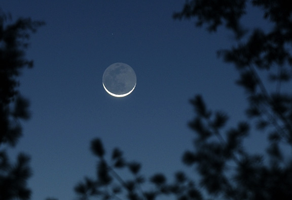 Here, the brilliant crescent Moon is illuminated by direct sunshine. The "dark" side of the Moon is visible by Earthshine, sunlight reflected off the Earth back to the Moon. There is a tremendous amount of difference in brightness between the bright Sun-lit crescent, and the much larger portion of the Moon lit by Earthshine. It is impossible to expose both correctly in a single frame. In this case the correct exposure for the bright crescent was 1/1000th of a second at f/2.8 at ISO 400, and the correct exposure for the Earthshine was 1 second at f/2.8 at ISO 400. This is about 10 stops difference in exposure. If the correct exposure for the bright crescent had been used, detail, such as craters, would have been visible on the crescent portion, but nothing would have been visible on the dark side of the moon, nor would there have been any color or brightness in the sky, and the silhouetted leaves would not have been seen. For this image, the exposure for the Earthshine was used, which also happened to be close to the correct exposure for the blue sky. Because this exposure was so much longer than the correct exposure for the crescent, the crescent is greatly overexposed and no detail is visible on it. Several different exposures were made, "bracketing" each exposure a couple of stops plus and minus on the meter reading. "Bracketing" is an old professional photographers trick to ensure a correctly exposed image under conditions where it is difficult to determine exactly what the perfect exposure is, such as this one. The image was also examined on the LCD on the back of the camera to ensure correct exposure. The image was shot of a fixed tripod because it is impossible to hand-hold a one-second exposure at 135mm of focal length. |