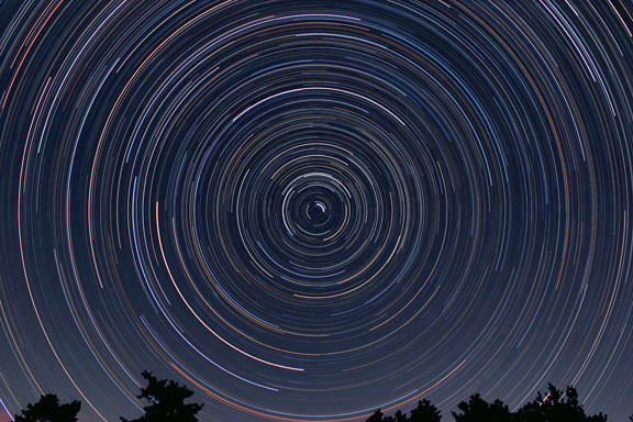 Star trails are the easiest kind of night astrophotography to get started with. In addition to demonstrating the Earth's rotation, they can be amazing and beautiful! In the days of film, one long exposure, sometimes up to several hours in length, was made. Today with digital cameras, we need to make a series of short exposures, each several minutes in length, and composite them together to get nice long star trails. The length of the star trails depends on how long the shutter is open, or how many individual short exposures you composite together. In 24 hours (23 hours 56 min 04.0905 seconds to be exact)the stars make one revolution around the celestial pole. If the daylight didn't interfere and you exposed for 24 hours, the each star would make a complete circle of 360 degrees around the celestial pole. In 12 hours, each would make a half circle of 180 degrees, and in 6 hours, a 1/4 circle of 90 degrees. With traditional film cameras, taking star trail photos could not have been simpler. You just put the camera on a tripod, focused the lens on infinity, locked open the shutter and exposed the film for a couple of hours, depending on the darkness of the sky at your observing location. With digital cameras, it is a little more complicated because of the thermal noise that is generated inside of the camera during long exposures. The problem is that this thermal noise builds up to unacceptable levels in digital cameras when the exposures go too long. How long depends on the inherent noise in the individual camera and the ambient temperature. Even the best digital cameras can't go for the multiple-hour exposures that can be taken with film cameras. This thermal noise will usually limit exposures to about 5 to 10 minutes. Tricks of the Trail If you want really long star trails, there is a trick to get around being unable to shoot long exposures. You simply shoot a lot of short exposures and then easily combine them in Photoshop, or use freeware programs like Achim Schaller's StarTrails, Markus Enzweiler's freeware StarStaX, or StarMax to combine the images. StarTrails will composite all of the short exposures together automatically. In Photoshop you will have to combine all of the short exposures manually. Place them one on top of another as a layer, with each layer set to "lighten" as the blending mode. Or you can try using Chris Schur's Star Trail Action. In the photo above, with the camera on a fixed tripod, six 8-minute exposures were made with a Canon 1D Mark II digital SLR camera with a 16 -35mm zoom lens working at 16mm at f/2.8 at ISO 400. Because the camera is pointed north, and because the Earth rotates on it's own axis, during the exposure the stars seem to revolve around a point in the sky very near to Polaris. This point is called the North Celestial Pole, and it is coincident with the Earth's axis of rotation. Of course, you don't have to point the camera north, you can point it anywhere in the sky you like. If you point it east in the winter, you might record something like Orion rising on the horizon.