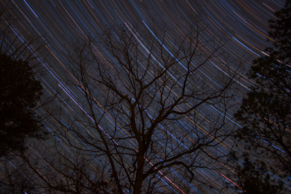 Also, if you put something in the foreground, such as an observer or telescope, the photo will be that much more interesting. Camera - You only need a camera which has a shutter that can be locked open for several minutes. This usually means you won't be able to use a point and shoot digital camera, whose exposures are normally limited to 15 to 30 seconds at most. Check your camera's instruction manual, to find out what is the longest exposure it is capable of. You will probably need a camera with a "bulb" setting which holds the shutter open for as long as the shutter release is pressed. However, even if you can only shoot 30 second exposures, you may still be able to shoot star trails if you can find a way to automate the exposure series and take a lot of exposures. Batteries -Cold kills batteries. Your camera's shutter only stays open by battery power, so make sure you have fresh batteries in your camera before getting started. Remote Release - You will need a cable release to lock the shutter open during the time exposure. These days this is usually a proprietary device made by your camera manufacturer, although with some cameras, such as the Canon Digital Rebel, you can easily make your own with a simple switch and mini-phono plug. Other cameras, such as the Nikon D70, will only work with an infra-red remote release. Again, check your camera manual to see what you need. Canon also makes a more sophisticated remote release called the TC-80N3 that has digital intervalometer capabilities built into it. You can also get a cheap Chinese clone from Aputure on Ebay for about $50 (Search for "Aputure timer remote" on Ebay). This means that you can set one of these to take any number of exposures, at any length exposure time, at any interval, automatically. This kind of automatic programming ability comes in very handy when attempting to take multiple-hour exposures with a series of 5-minute sub-exposures. It is also possible to automate the exposure sequence with software that controls the camera such as Images Plus, and DSLR Focus, but you will need a computer for to do this. For the latest generation of cameras, the manufacturer's software should also allow you to do this with a computer. Tripod - You don't absolutely need a tripod. You can use a bean bag placed on a sturdy surface, like the ground, or a picnic table, or the roof of your car. Don't lean on the car or get in it, or open or close the doors during the exposure though because if the camera moves during the exposure, the stars will move too, and will record as squiggly lines and not as nice, aesthetically pleasing, straight lines. It will be more difficult to successfully accomplish a large series of exposures by hand if you're not using a remote release. If you do have a tripod, use it. Lens - What kind of lens should you use? Well, the one you have, of course! Any lens will work for star trail photos. Wide angle lenses can work especially well. Aperture and Exposure and ISO - The exposure length will be determined by the darkness of your site, and the ISO you are using, and the f/stop of the camera lens. For film, if you wanted to shoot really long exposures, you needed a really dark site and a night when the moon will not be up during the exposure. The cool thing about star trails with a digital camera is that the sky can be relatively bright, but you will still be able to create an image with long trails. Each sub-exposure should be exposed long enough to put some color in the sky, but not long enough to overexpose it. This sky brightness will then stay the same when the individual sub-exposures are combined. To determine the correct exposure for a given combination of aperture and ISO settings, take a test exposure and look at the histogram on the back of the camera. A good exposure to aim for will be when the peak of the "mountain" of the histogram is about 1/3 to 1/2 of the way from the left hand side of the histogram to the right. The first time you go out, try shooting a series of different exposures at about ISO 400: 30 seconds, 1 minute, 5 minutes, and 10 minutes. Note the temperature at which you made the photos. Then examine them later on your computer at high magnification, and see which one's noise you can live with. When ambient temperatures are very cold, you can get away with longer exposures. Also, try shooting these test exposures at different apertures, starting with the lens' widest and fastest setting, usually f/2 or f/2.8. Then shoot some more test exposures stopping the lens down one stop, and some more stopping the lens down two stops. The lens' optical performance will get better as you stop it down, but it will also not be able to record as faint stars. If you have a decent lens, you will probably be able to use it around f/2.8. Remember that every time you stop the lens down one stop, you have to double the exposure. Experiment with different ISOs in the camera. When you get back home and are examining these test exposures, you will find a compromise between the amount of noise, the best lens performance, and the faintest star trails that are recorded. Information such as exposure length, aperture and ISO will be recorded in each file's EXIF data that is saved with the file. This information can be read in Photoshop under File > Info, or in a great little program called EXIF Reader which you can download for free. These parameters will be what you use the next time you go out to shoot some star trails to get the best results. If you are shooting from a site with light pollution, the length of your exposure will be limited by how bright the sky is. You can only find out by doing some test exposures. Stopping down the lens does not really solve this problem, because as you stop the lens down you will record less faint stars, no matter how long you expose for. Luckily, once you have determined your optimum exposure so that the sky fog from light pollution is not so bad, you can get the equivalent of m