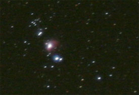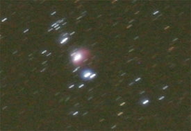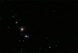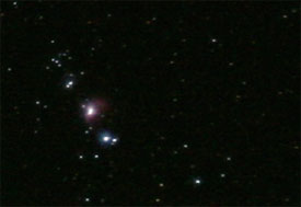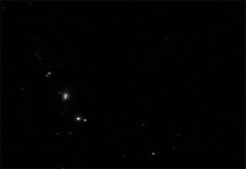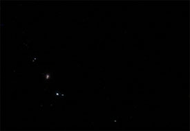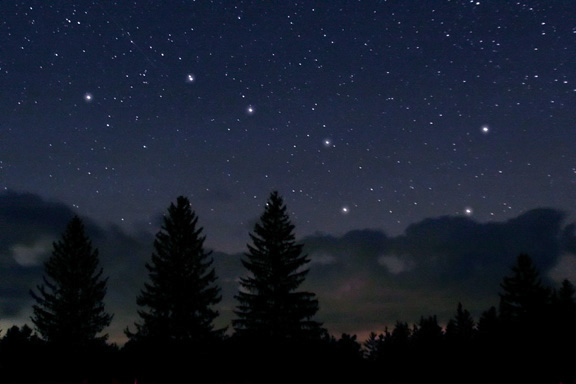 Method Almost all of the methods for shooting constellation photos are exactly the same as shooting star trails. The only difference is that you want to find that sweet spot of exposure length where you expose long enough to record as much faint detail as possible, but don't expose too long so that the stars trail too much. Again, with digital cameras we have the luxury of being able to make a test exposure and then examine the image and histogram on the back of the camera to determine the optimum exposure. Not much more is needed than a tripod and camera whose shutter can be kept open for up to 30 seconds. The same suggestions for star trail photography given in the previous section also apply here, only the exposures are much shorter. Use the self timer or cable release to open the shutter, and make sure the lens is focused on infinity. Set the lens aperture to wide open or stop down one stop. Your exposure should be anywhere from 5 - 30 seconds with a lens in the focal length range from wide angle to about 50mm. Try to use a high ISO, such as ISO 800, 1600, or 3200. Experiment with different settings and see which turns out the best. If you can put something in the foreground, the picture will be that much more interesting. In the case of the image at the top of this page, I positioned the camera so that there were some trees in the foreground. As a final special touch, a "fog" filter can be used on the lens. This filter is simply a diffusion filter that is used in portraiture to give a soft-focus effect, diffusing and enlarging the brighter stars and planets in the image. "Fog" filters give a nice effect on constellation photos, making the bright stars that define the shape of the constellation easy to pick out. This photo did not require a telescope equatorial mounting to track the stars to compensate for the Earth's rotation because the exposures were kept short enough so that star trailing was not objectionable. Complicated formulas can be used to calculate the length a star will trail based on the length of the exposure, focal length of the lens used and declination of the object photographed. As a rule of thumb, exposures of about 8 - 10 seconds can be made with a 24mm lens for objects on the celestial equator before the trailing becomes noticeable. You can try longer exposures with wide angle lenses or if the camera is pointing more towards the north or south. The longer the focal length of the lens you are using, the quicker the stars will trail. Try shooting a series of exposures of 5, 10, 20 and 30 seconds. Generally, if you can see a star or planet with your unaided eye, you can photograph it on a fixed tripod with an exposure of about 10 seconds at f/2.8 with ISO 400. The examples at right show were taken with the camera on a fixed tripod, all at the same ISO. Only the exposures were changed. They illustrate several different points about photography on a fixed tripod: Notes