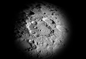 Focus the telescope at infinity. Focus the camera lens at infinity. The camera is held up to the eyepiece and the photograph is made. Care must be taken to hold the camera so that the focal plane is perpendicular to the optical axis and it does not move during the exposure. The camera should be at the focal length of the camera lens away from the eyepiece so that the exit pupil of the scope is located at the iris diaphragm of the lens. For long focal length eyepieces, it may be a problem making sure the eyepiece is focused on infinity because of the eye's accommodation. To solve this problem, a finder scope or binocular can be focused on infinity first, and then held up to the telescope eyepiece. The telescope eyepiece is then focused at infinity through this auxiliary instrument. The equivalent focal length of the system is the telescope's magnification multiplied by the focal length of the camera lens. For example, the picture above was made with a 12.5 inch f/6 telescope. That is 75 inches of focal length, or 1905 millimeters. The telescope eyepiece had 18mm of focal length. The magnification through the eyepiece was 1905/18 = 105x. The equivalent focal length of the entire system: telescope, eyepiece, and camera lens is 105 * 50 = 5,250 millimeters. The focal ratio of an afocal system is determined in the usual manner, the focal length divided by the diameter of the objective. In this example, the focal length is 5,250 millimeters divided by the diameter of the objective, which is 12.5 inches or 317.5 millimeters. The formula gives us 5,250 / 317.5 = 16.5. So the focal ratio of the system is f/16.5. Remember that exposures get longer as the focal ratio of the optical system increases. For objects such as the moon, which fill the frame, you can simply take the exposure at the camera's meter reading. For other objects, you can make a guess and take a test exposure and examine it on the LCD on the back of the camera. Vignetting