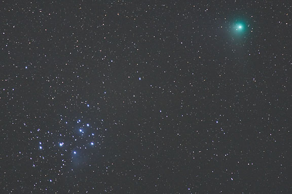 The next step up in long-exposure deep-sky astrophotography is to place a camera with a longer focal-length lens on top of a polar-aligned, equatorially-mounted telescope. Because the scope and camera are mounted on an equatorial mount, it can track the stars with movement of only it's right ascension axis. If the mount is accurately polar aligned, it can follow the stars for longer time exposures of up to several minutes. Such a setup can yield time exposures with longer focal length lenses that reveal more detail in celestial objects. Here, the greenish-blue color of the coma of the comet can be seen, as well as some blue reflection nebulosity around the Pleiades. The photo above was taken with an zoom lens piggybacked on top of a refractor that was on a Losmandy equatorial mount. It was shot with a Canon 1D Mark II DSLR camera at ISO 800. The photo is a 3 minute exposure taken at f/2.8 at 200mm of focal length. At this focal length of 200mm and exposure time of 3 minutes, the mount had to be fairly accurately polar aligned. In this case, polar alignment was accomplished with a polar-alignment scope. Drift polar alignment was not necessary for this combination of focal length and exposure. If you are going to use a push-pull zoom lens, make sure you tape down the zoom as well as the focus because the focal length can change if the zoom moves during the exposure. This can happen very slowly during the exposure just from the weight of the optical elements in the lens. |