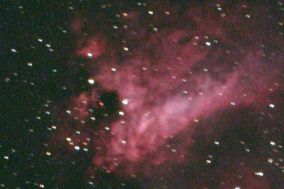 In the unguided image above, we can see the results of an exposure that was too long for the accuracy of the mount's tracking. In this case, ten 3-minute unguided exposures were made, but only one had tracking that was accurate enough to be usable. Unguided Astrophotography With the widespread use of DSLR cameras for long-exposure deep-sky astrophotography, a school of philosophy has developed that says you might be able to get by without guiding at all, depending on the focal length you are shooting at, and the drive's accuracy. This can be very attractive because guiding adds additional expense and complexity to an astrophotography outing. Manual guiding requires the expense of either an off-axis guider, or separate guidescope, rings, diagonal, guiding eyepiece and is extremely tedious. Autoguiding requires the additional expense of an autoguider and computer. Guiding is usually done for very good reasons. At long focal lengths, imperfections in the mounts drive can show up as elongated or irregular star shapes. In addition to periodic error, a star will also not track perfectly because of atmospheric factors such as refraction. But if you can keep exposures short enough, you can mitigate these effects. The philosophy of not guiding is based on the ability of your mount to track accurately enough so that your exposure can be long enough to get the data up out of the read-out noise of the camera. This is critical! Once you do this, however, you can simply stack many of these short exposures together to improve the signal-to-noise ration in the final image. To get by without guiding, your focal length must be relatively short, the optical system must be fast enough so that exposure times are relatively fast, and your camera must be low-noise enough so that these short exposures are not dominated by noise. In practice no telescope drive is accurate enough to produce perfectly tracked pictures at longer focal lengths. So a series of trial and error experimental exposures are made to see how long of an exposure you can use without it being ruined by poor tracking. Some telescope drives will track accurately for a significant portion of the worm's period, but not very well during the rest of it. In this case, the photographer simply accepts some given percentage of successful shots out of the total number of exposures. For example, you may find that you can shoot three minute exposures with a 70 percent success rate. So if you shoot 10 three-minute exposures, you just throw out the 3 bad ones and keep the 7 good ones. The best thing to do is to simply take a series of timed test exposures at the optimum exposure for your ISO and sky brightness conditions. You will need to take a sufficient number of frames at this exposure to that you go through a complete worm cycle on the mount's right ascension drive. For example, if your worm has a period of 8 minutes, and you find that 2 minute exposures are optimum, you should shoot a series of 5 two-minute exposures for a total of 10 minutes. This will go through an entire worm cycle with a little extra. You will find out how many usable frames you can get per worm cycle because frequently on drives with a lot of periodic error, you may only get usable frames at the ends of the cycle where the periodic error is reversing direction. Examine the stars in the image at high magnification. You may find that you need to increase the ISO to give shorter exposures to yield a sufficiently high number of acceptable frames. It seems a shame to waste valuable clear dark-sky time gathering photons that will improve the ultimate quality of the image and then to throw 30 percent away because of poor tracking, but this is the price some astrophotographers are willing to pay for the convenience of not having to guide. For many short focal length camera lenses (usually about 100mm or less) mounted piggyback on top of a tracking scope on an equatorial mounting, guiding is not necessary at all. This is why piggyback astrophotography is recommended first before long focal length work through a telescope. Note that even if you do not guide, accurate polar alignment is still required. If your ultimate goal is to get the best possible pictures that you can, you will find that longer exposures usually produce better results because they improve the signal-to-noise ratio. With long focal lengths, and long exposures (anything over a couple of minutes), you will almost certainly find that guiding produces the best results. Deciding Whether to Piggyback Guide or Off-Axis Guide The next decision you will have to make is whether to guide with a piggyback guide scope, or to use an off-axis guider. Piggyback guide scopes are easier to use and can be very successful if the guide scope and main scope are both refractors and the guidescope is rigidly mounted to the main imaging scope. Various degrees of success will be obtained with other combinations of main scope and guide scope. Using two scopes with mirrors usually does not work very well at all because of differential mirror movement and flexure. Off-axis guiders are more difficult to use, but if used correctly work very well with any kind of telescope. Because an off-axis guider uses the imaging scope itself to acquire a guidestar, it is inherently better by design. There can be no flexure between the guidescope and imaging scope because there is no guidescope. Using an off-axis guider with an autoguider that is not sensitive can be tedious. The off-axis guider will usually have to be rotated independently from the imaging camera to find a guide star. If a sensitive autoguider is used, such as a Lodestar, a guide star will almost always be found in the field without having to rotate the off-axis guider. A sensitive camera is a tremendous help when using an off-axis guider. The down side is that more sensitive cameras are more expensive. Guiding and Tracking Tolerances You want to keep star diameters as small as possible and not ha