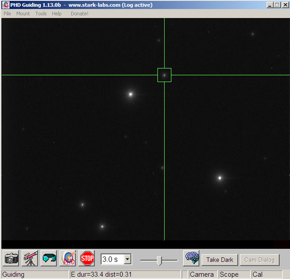 Evaluation Evaluate your guiding. Keep an eye on the graph. Remember the scale is in pixels. Large erratic excursions up or down indicate a problem. Keep an eye on the oscillation index and RMS. Remember though that these are general indicators only. The ultimate test of your guiding accuracy for your particular system is to examine the stars in the image at high magnification. If they are bloated, you may have bad seeing. If they are elongated, you have a guiding / tracking problem, or possibly flexure between the main imaging scope and guidescope. If stars are trailed east-west, there is a problem in right ascension. If stars are trailed north-south, there is a problem in declination. If stars are trailed on a diagonal between right ascension and declination, you may have problems in both axes, or you may have flexure, or you may be using incorrect settings in PHD. In general, try making changes to lower values in the adjustments to start out with. Oscillations are usually caused by the mount trying to chase the seeing with too small of a minimum motion value and values too large for RA aggressiveness. Try a longer exposure time for bad seeing, and increase the size of the minimum motion for longer focal lengths. At long focal lengths, the seeing in especially important. On nights of bad seeing, when attempting to shoot with my C11, I have found that the guiding will be poor, no matter what settings are used. How Long Can You Shoot with an Altazimuth Mounting? If you are using an altazimuth mounting that is not polar aligned with the north celestial pole, you can still shoot time exposures, but they will be limited in length by field rotation. Because field rotation in an angular error, it is independent of focal length. In a study by Michael Covington, he found that for an observer located at 40 degrees north latitude, photographing an object on the celestial equator and meridian, the field will rotate at 0.2 degrees per minute, limiting the maximum exposure to 30 seconds. With exposures this short, a fast optical system is recommended. It is possible to shoot 30 second exposures at ISO 1600 with a very fast aperture and add or average a lot of short exposures to equal a longer one and get good results. See the astrophotos of John Ambrose for examples. For longer exposures an equatorial mount is required, or a field de-rotator. Field de-rotators however will only work at prime focus of the telescopes they are designed for and will not help with piggyback photography.