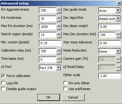 The next item is a pull-down menus for guide camera exposures. You can increase this if you can't find a star, or decrease it if the star is too bright or too dim. It is better to guide on a star that is not too bright or saturated. It is also better to guide on a star that is not too dim as it will have a low signal-to-noise ratio. Next is a slider that adjusts the screen brightness in PHD. The next icon is the Brain. This calls up the Advanced Panel, which allows the fine tuning of different settings in PHD. Most times the default settings will work fine, but for large scopes with long focal lengths some settings may need to be adjusted.