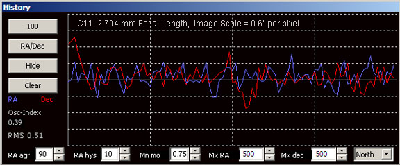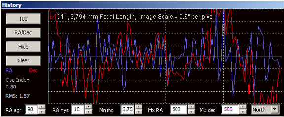 Note that the oscillation index and RMS readouts are only for the right ascension guiding. Ideally, there will be no oscillation in the declination because you will have determined the direction of drift in dec and enabled corrections in only that direction.