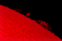 Very narrow-width bandpass hydrogen-alpha filters (less than one angstrom) can be used for Solar work which reveals high-contrast detail on the face and limb of the sun in hydrogen-alpha light. The photo at right shows several limb prominences. It was taken with a 7" f/9 Triplet Apochromatic Refractor and Barlow projection at approximately f/27 on a Nikon D2H DSLR camera at 1/30th of a second exposure at ISO 800. The 0.2 angstrom Hydrogen-alpha filter was manufactured by Solar Spectrum and was working at 140mm of aperture with Red #25 glass energy rejection filter.