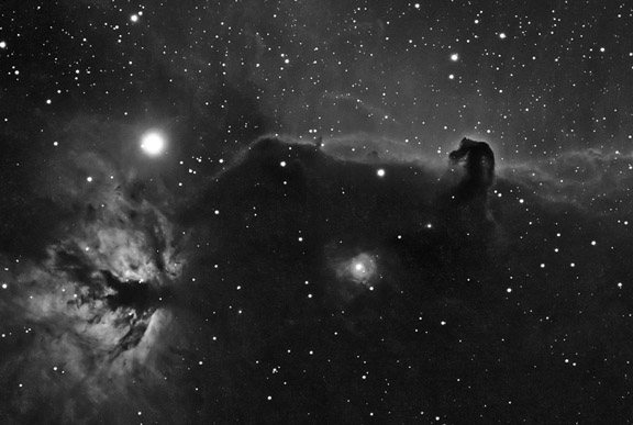 Wide bandpass filters, usually more than 10 nanometers wide, filter out most of the rest of the spectrum and increase the contrast between the wavelength of interest and the sky. Because most of the rest of the spectrum is filtered out, the intensity of stars in the image, which produce light across the entire spectrum, is reduced. This results in smaller, less-prominent stars. Wider bandpass filters work better with fast optical systems where the bandpass may shift as the light moves off-axis because of the steep light cone. Very narrow bandpass filters, usually only a couple of nanometers wide, increase the contrast even more between the wavelength of interest and the sky, but require longer exposures. Extremely narrow hydrogen-alpha bandpass filters, usually less than one angstrom wide, are used for solar work. Narrowband imaging can allow photos of supernova remnants, planetary nebulae, and certain emission nebulae to be taken on nights when the moon is up since most of the spectrum which brightens the sky is filtered out. Narrowband filters for DSLRs can be purchased from Astronomik, Baader and Hutech. Representative Color Imaging True-color imaging is generally regarded as color astrophotography that seeks to present images as the eye would see colors if the object were bright enough to stimulate the color-sensing cone cells in the retina. This is a complicated question, especially with emission nebulae. If images are carefully calibrated, imaged correctly through the proper filters, accurately combined, calibrated and white balanced on a G2V spectral-class star, it is possible to produce reasonably accurate "true-color" images of deep-sky astronomical objects. It is also possible to shoot wavelengths that are invisible to the human eye, such as infrared and ultra-violet. If these images are presented in color, some color must be arbitrarily assigned to them. This creates the possibility of arbitrarily assigning any wavelength to any of the primary colors of red, green and blue in a normal color image. This type of color creation is done, for example, with the Hubble Space Telescope where SII, Ha, and OIII are assigned to R, G, and B, respectively. Black and white images taken through these and other narrowband filters can be combined into assigned-color, or representative-color images. Each wavelength, usually in order, is assigned to one of the channels of an RGB image. For example, Hydrogen-beta at 486.1 nm may be assigned to the blue channel, Oxygen III at 500.7 nm may be assigned to the green channel, and Sulphur II at 672.4 nm may be assigned to the red channel. Hydrogen-Alpha (H-alpha) Filters H-alpha filters are probably the best known because the hydrogen-alpha wavelength is responsible the red color of emission nebulae. Long-pass filters cut off all of the wavelengths of light that are shorter than 656.3 nm and pass everything longer, such as near infrared and long infrared. Narrowband hydrogen-alpha filters are usually used with CCD cameras and pass only a narrow range of wavelengths centered around the hydrogen-alpha emission wavelength of 656.3 nm. The human eye is only slightly sensitive to hydrogen-alpha light. Therefore focusing a lens or telescope through a hydrogen-alpha filter is extremely difficult to accomplish visually. It is best to focus by test exposures and trial and error, or by using a clear filter of the same thickness and refractive index and then substituting the h-alpha filter. Some people think that it is not productive to use h-alpha filters with DSLR cameras because of the Bayer matrix of color filters over the individual pixels. Because the ratio is 2 green filtered pixels to 1 red and 1 blue, only 1/4 of the pixels in a sensor are sensitive to red light. Although this reduces spatial resolution somewhat, all of the pixels are used when the color is created when the image is de-Bayerized. The image of the Horsehead Nebula at the top of this page is an example of what can be done with a DSLR and long-pass cut-off hydrogen-alpha filter. As seen in the image above, it is also possible to use a high-contrast h-alpha filtered image to enhance the red by using the technique of channel substitution. With this method, the red channel of the hydrogen-alpha image is swapped for the red channel in a separate full color RGB image, or for the L channel in an LRGB color image, or in other combinations. These methods will be discussed further in the section on channel substitution in the chapter on image processing. This type of long-pass cut-off hydrogen-alpha filter can be found at Hutech, and Lumicon.