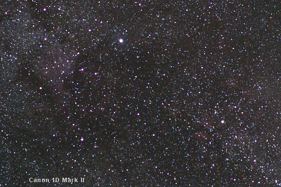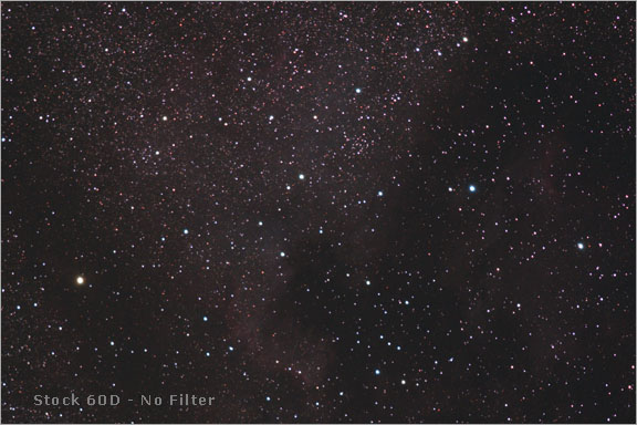 For examples, see Gary Honis' web page on correcting the white balance of a modified Canon 300D. Light Pollution Filters Light Pollution Reduction (LPR) or Light Pollution Suppression (LPS) filters, such as Hutech's IDAS LPS filter, Lumicon's Deep-Sky filter, and Astronomik's CLS filter, do a good job of filtering out wavelengths dominated by man-made light pollution, and passing wavelengths emitted by astronomical objects. This darkens the sky considerably and increases the contrast between the astronomical object and sky background at the same exposure. It also allows a longer exposure to record even more signal from the object. Light pollution reduction and suppression filters work very well under light-polluted skies, but also help even at dark-sky observing sites because they also reduce the natural brightness of the night sky caused by airglow. This also helps increase the contrast between the sky and object. We can see from the above comparison of the North America nebula shot with the same stock, unmodified, Canon 60D camera that it is possible to shoot red hydrogen-alpha emission nebula with an unmodified camera. The IDAS Light Pollution Suppression filter allows a three-times longer exposure at the same site with the same ISO and f/stop. This allows fainter stars to be recorded as well as more nebulosity. The secrets to shooting red emission nebulae with an unmodified camera are: