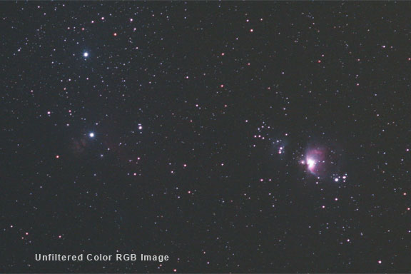 Filters are used to modify the spectrum of light that reaches the sensors in our digital cameras. They may be used to reduce the intensity of the light, isolate a particular wavelength of interest, or block out wavelengths that are not particularly interesting, such as those dominated by light pollution. Narrowband filters are centered on a particular wavelength, and with a bandpass that passes a window of wavelengths on either side of the central wavelength. Long-pass filters let wavelengths pass that are longer than the cutoff wavelength. Short-pass filters pass wavelengths that are shorter than the cutoff wavelength. Other filters can be used, not to affect the wavelengths of the light they pass, but rather for artistic effect, such as fog, soft-focus, or cross-star filters. Although they are not used in DSLR cameras because each individual pixel has its own colored filter over it, Red, Green and Blue filters are also used with black and white astronomical CCD cameras to create color images. RGB Tri-Color All CCD and CMOS sensors are monochromatic. That means they are black and white, and grayscale devices. Color is usually created by photographing light through filters of three colors - red, green and blue. Dedicated astronomical CCD cameras shoot three separate exposures, one each through a red, green and blue filter, and then these individual black and white images are combined into a full-color image. Most DSLR sensors, whether CCD or CMOS, also create color by using red, green and blue filters, but do it in one shot. Each individual pixel has either a red, green or blue filter over it in a Bayer array. A computer algorithm examines the color of each pixel in a 4-pixel group and creates full color for each of them, even though they technically only see the primary color from whatever color filter is over them. These "one-shot" color cameras do a very good job of reproducing accurate color. It will do you no good to try to shoot a color image through individual red, green and blue filters with a DSLR. These filters are already built into the sensor. DSLR Long-Wavelength, Low-Pass Filters Almost every consumer DSLR camera has a special filter built in to the camera in front of the CCD or CMOS sensor. This filter serves two functions. The low-pass function of the filter to apply a slight blur to the image to reduce the effects of aliasing and moire. The other function is to filter out long wavelengths of light which can cause undesirable color reproduction, particularly in skin tones of certain individuals. Unfortunately, these long-wavelength filters also filter out most of the light at the hydrogen-alpha wavelength of 656.3 nm. This is the wavelength that gives emission nebulae their beautiful red color. Consequently, since most of this light is filtered out, stock DSLR cameras don't take very good pictures of emission nebulae. The only exceptions to this in stock cameras are the Canon 20Da and 60Da, which have a specially modified filter that passes 2.5 to 3 times as much of the red hydrogen-alpha light as a normal unmodified camera. In the image comparison above, we can see the difference that a filter that passes more hydrogen-alpha light makes. The images were shot at different f/stops which accounts for the difference is sharpness and size of the stars. The image taken with the Canon 1D Mark II camera was a 5 minute exposure at ISO 800 at f/2.8. The image taken with the Canon 20Da camera was a 5 minute exposure at ISO 800 at f/4. Even though the 1D Mark II exposure was shot at twice the aperture, giving twice as much exposure, the 20Da image has clearly recorded much more hydrogen-alpha red emission nebulosity because this camera does not filter out most of the hydrogen-alpha light. Some photographers remove this long-wavelength filter completely to make the camera sensitive not only to hydrogen-alpha wavelengths, but also to longer wavelengths, making true infra-red photography possible. Others have replaced the filter with one that passes hydrogen-alpha light for astrophotography of emission nebulae, but blocks the longer infra-red wavelengths. When the manufacturer's stock filter is removed, the camera's warranty is voided and additional filtration must be used to achieve correct color balance for normal daytime photography. Note that modifying the camera and totally removing the low-pass filter in front of the CMOS sensor may render lenses unable to focus at infinity. Some that focus past infinity, usually auto-focus lenses, may have enough focus travel range to reach infinity, but some may not. Lenses that stop directly at infinity will not be able to focus at infinity if the filter is completely removed. To overcome this problem, clear glass of the same thickness and refractive index needs to be substituted for the filter that is removed. This allows these lenses to reach focus at infinity and the camera to autofocus correctly. The color balance and exposure however, will not be correct. It is also possible to replace the filter with glass that filters different wavelengths, such as Ultra Violet and Infrared. A variety of different filters for light-pollution suppression, nebula enhancement, hydrogen-alpha, UV/IR and daylight-balance can be purchased for most Canon DSLR APS-C sensor cameras that fit in the camera body's mirror box, behind the lens mount, and in front of the mirror. Daylight Balancing Filters If the manufacturer's low-pass, long-wavelength filter is removed from a DSLR camera, or replaced with a different filter, the camera's daylight color recording capabilities will be affected. These camera's de-Bayerizing color-creating algorithms are finely tuned to work with the particular sensor, individual red, green and blue filters over the pixels, and the low-pass, long-wavelength filter. To restore normal correct color balance for daytime shots with a modified camera, a replacement filter must be used that mimics the original manufacturer's long-wavelength fil