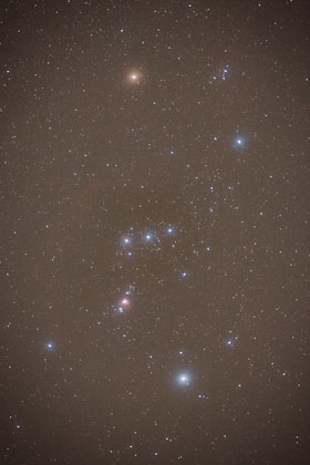 The processing that we will apply to our images is designed to make the astrophotograph look good aesthetically. This type of processing is designed only to produce "pretty pictures" and not scientifically accurate data. The image of Orion seen above has been processed with the basic steps listed above. It was taken with a Canon 20Da DSLR camera. It was a single frame, 30-second exposure shot with a lens of 35mm focal length at f/2.8 at ISO 3200 with a fog filter to diffuse the stars. It was taken at 33F ambient temperature. The original was a JPEG shot in the camera with the white balance set to daylight. Contrast and sharpening were set to normal, and no special color correction was applied in the camera. In-camera noise reduction was turned off.