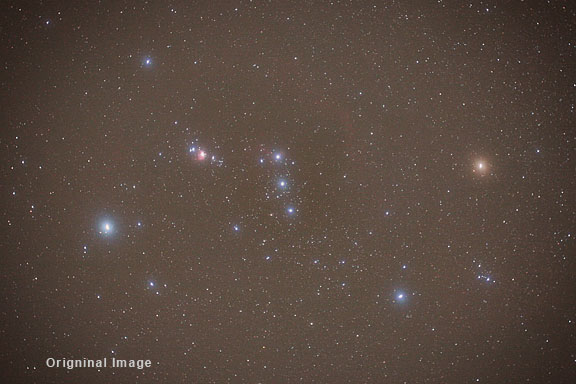 Open this tutorial image of Orion in Photoshop. It is contained on the CD-ROM in Practice > Orion folder. The very first thing we notice is the typical ugly brown sky so often recorded in long-exposure deep-sky astrophotographs taken with digital cameras when the white balance is set to daylight, even at dark-sky sites. Part of this particular image's color comes from the Canon 20Da's extra sensitivity to red, but this red / brown color is also recorded with normal digital cameras that still have their standard long-wavelength filter in front of the sensor. This color comes from the "foreground" sky influenced by the Earth's atmosphere. It is mostly faint airglow that is recorded by the camera but some local light pollution is probably mixed in from this observing site. We will subtract this foreground sky color when we adjust the image in Photoshop. Examine the Histogram