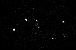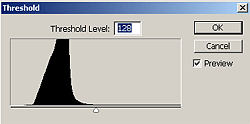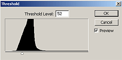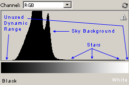 In Photoshop go to Window > Histogram. Looking at the image's histogram in Photoshop, we can see that this is a good exposure. The bulk of the pixels in the histogram, represented by the large "mountain" lie about 1/3 of the way from the left side to the right of the histogram. A histogram is a graphic chart that shows the distribution of pixels by brightness in the image. The relative number of pixels are represented on the vertical axis of the graph, and the brightness of the pixels on the horizontal axis. Black pixels are all the way to the left and white pixels all the way to the right, with corresponding shades of gray in between. The mountain represents the sky in the image where most of the pixels are approximately the same brightness. On the right side of the histogram, stretching from the mountain to the right edge, is a thin line at the bottom, representing the stars in the image, and their gradual fall-off from the bright core to the brightness of the sky background. On the left and right sides of the histogram, we can see breaks in the thin line at the bottom, and that the histogram does not reach all the way to the left or right edges where the darkest and lightest pixels in the image are represented. This means that we do not have any pixels in the image that are pure black or pure white. Because the histogram does not reach all the way to the edges, it means that there is dynamic range, or contrast, in the image that is not being used. Later we will stretch the tones in the image and re-define the darkest pixels as black and lightest pixels as white. This will increase the contrast of the final image and maximize the use of the available dynamic range. Next, we'll look at the darkest and lightest pixels in the image. This is done with the threshold command. It can be accessed under Image > Adjustments > Threshold. When invoked, the image will now look like this: In the threshold dialog box, we can see the lightest pixels in the image if we move the slider all the way to the right and slowly move it back towards the center. The brightest stars in the image contain the brightest pixels. Likewise, we can see the darkest pixels in the image by moving the slider all the way to the left and slowly moving it back towards the center. When we do this, we see that the darkest pixels are in the corners. As we move the slider more towards the middle from the left, the corners grow darker. This tells us that we have some vignetting in the frame. This should be corrected first. Cancel the dialog box without applying the threshold to return to the original image. We only used the threshold dialog to find the lightest and darkest pixels in the image for our information. Critical Examination While examining the image, it is a good idea to enlarge it to 100 percent or more to check the focus and tracking and other defects such as plane and satellite trails. If there are any serious issues which severely compromise the quality of the image, it may have to be shot again if only a single frame was taken. If multiple frames were taken and are to be combined, it's a good idea to discard an individual frame that is less than optimum because it will degrade the quality of the final composite image. At this enlargement, you will also get an idea of how much noise is present in the image. In this case it is very little because the 20Da is a very low-noise camera to start with, and because it was used at 33F ambient temperature, which helped reduce the noise even more. This image looks so good it doesn't even need a dark frame to be subtracted, which is a good thing because we didn't shoot one! In the next section we will discuss dark frames and how shooting them can greatly improve your images, even is you only shoot JPEGs in the camera. |