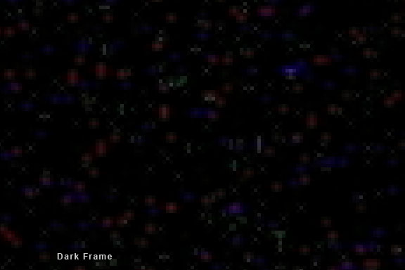 Video In our example image of Orion that we saw in the previous section, we only have a single light frame, and no dark frames. We can get away with this because the image was shot at a low ambient temperature and there isn't much thermal signal present. If we had shot at a higher ambient temperature, the situation would have been very different. There would have been thermal signal present in the form of hot pixels and color blobs that we would have needed to deal with. We will take a little detour here and discuss the great benefits of using dark frames to remove thermal signal, even for JPEG images. Thermal Signal Dark frames record the thermal signal in a DSLR camera. This is signal that is generated by heat in the camera, even when no photons are hitting the sensor. This signal is present in all frames, including light frames shot at long exposures. We can remove this thermal signal from the light frames by subtracting a "dark" frame. Shooting several dark frames and averaging them together to create a master dark frame can yield even better results. To shoot a dark frame, take your camera off of the telescope and put the body cap on, and cover the viewfinder eyepiece with its cover or a piece of black tape so that no light reaches the sensor. Then shoot an exposure, or series of exposures, equal in length to the light frame exposure, at the same ISO and ambient temperature as the light frames. Even if you only have one light frame, it can benefit from subtracting a dark frame to remove the thermal signal. Subtracting a dark frame, or master dark frame, is optimally done with Raw images. However, even JPEG images can benefit from dark frame subtraction. Both the light and dark frames can be JPEG images. If you shoot more than one dark frame, average them together to create a master dark frame. Then subtract the master dark frame from each individual light frame. Averaging multiple frames can most easily be accomplished in an astronomical image processing program like Images Plus, but it can be done in a regular image processing program like Photoshop.
