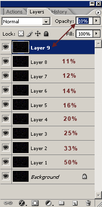 Open the first dark frame that you have shot. This will be your base image. Open the second dark frame. Copy and paste the second image as a layer on top of the first image. Change the blending percentage to 50 percent in the Layer's palette. Close the second image. Open the third dark frame. Copy and paste it into the first image. Change the blending percentage of this third layer to 33 percent. Repeat for each additional dark frame that you have. The following list gives the blending percentage for each layer as they are seen in Photoshop's Layers Palette. The background layer will always be on the bottom, and each additional layer is added on top.
