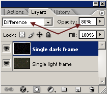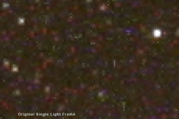 You don't have to have the total number of images and layers listed here, you may have more or less, although more than 10 are probably more easily combined in groups or in a dedicated astronomical image processing program. After you have all of the individual dark frames pasted as layers, and the blending percentages set correctly, then flatten the image. Go to Layer > Flatten Image. Then save the flattened image as an uncompressed TIFF File with the name "MasterDark.TIF". In the mouse-over example image above, a single dark frame has been subtracted from a single light frame, removing much of the thermal signal in the form of hot pixels and red and blue splotches of color, and improving the image. Note however that the background of the image after a dark frame has been subtracted still contains a lot of noise. This can be improved by averaging several light frames together as we will see in the next section. When you use Photoshop to subtract a dark frame, enlarge the image several hundred percent so that you can see individual pixels. You will be able to see the hot pixels and color noise blobs. If the temperature of your dark was higher than the temperature of your light frame, you may be left with dark holes after the subtraction. In this case you can adjust the opacity of the dark-frame layer as described in step 6 below, and make the match a little better. Subtract a Dark Frame from Each Individual Light Frame