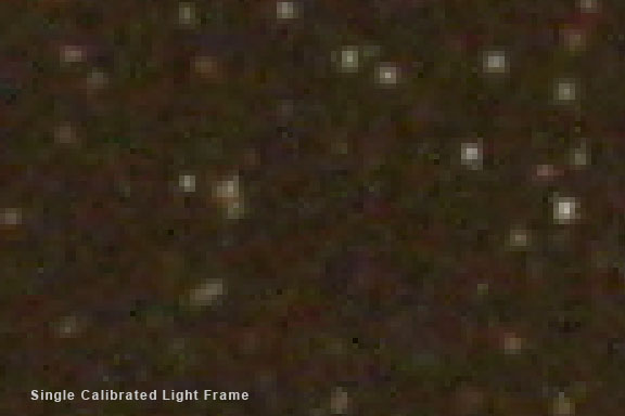Video Here we will take another detour from processing our single original JPEG image of Orion to discuss the advantages of shooting multiple light frames to improve the signal-to-noise ratio in your image. Along with using dark frames at temperatures that produce a significant amount of thermal signal, shooting multiple light frames and averaging them is one of the most beneficial things you can do to improve your images. Image quality is all about signal-to-noise ratio, and there is no other way to increase the signal except by gathering more photons. If you have shot multiple light frames, this is when you should combine them into a master light frame. You should do this after calibrating the light frames with dark frames. Even if you have not shot any dark frames, your image will still benefit greatly from combining more than one original light frame. The more light frames you can combine, the better the signal-to-noise ratio will be in the final image. It's pretty easy to shoot multiple light frames of the same object. You have already set up, focused, and framed the object, so all you have to do is trip the shutter again. In the mouse-over example above, we can see how the noise in the sky background is improved when nine calibrated light frames are averaged together. Averaging multiple light frames increases the signal-to-noise ratio in the image. Because noise only goes up with the square root of the total number of images combined, but the signal goes up directly, you will gain much by averaging many light frames. For example, if you shoot 9 light frames, say each one with an exposure of 5 minutes, then you will have 9 times the signal of a single frame, but only the square root of 9 (3) the amount of noise. So the signal-to-noise ratio will be 9 to 3 or 3 times greater than a single frame. Having a higher signal-to-noise ratio has the benefit of providing a much smoother sky background. When the image is stretched later to increase the contrast the result will be better because of this. Combining Light Frames can be done with many different mathematical operations, but for basic imaging, using a simple average is probably the best and easiest way to accomplish this. Averaging can be done in a general image processing program such as Photoshop as well as in astronomical image processing programs such as Image Plus. The method is pretty much the same as when we averaged the dark frames in the previous step.