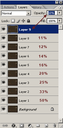 Open the first light frame that you have shot. This will be your base image. Open the second light frame. Copy and paste the second image as a layer on top of the first image. Change the blending percentage to 50 percent in the Layer's palette. Close the second image. Open the third light frame. Copy and paste it into the first image. Change the blending percentage of this third layer to 33 percent. Repeat for each additional light frame that you have. The following list gives the blending percentage for each layer as they are seen in Photoshop's Layers Palette. The background layer will always be on the bottom, and each additional layer is added on top.