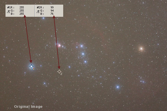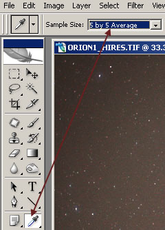 The eyedropper tool is used to measure the pixel values in the image. Whatever pixel is under the tool as it is moved around in the image will have its red, green and blue channel values displayed in the info palette. The sample size of the eyedropper should first be set to a 5x5 pixel grid. If it is left at the default of a point sample, it will only measure the pixel values of the single pixel it is over at the time. Because there are random "rogue" pixels sometimes, it is best to set the sample size to a 5x5 pixel box. Then the readouts will be an average of this 5x5 pixel box, and rogue pixels will be averaged out. Click on the eyedropper tool in the tool's palette, and select a 5x5 pixel average in the tool's options under the pull down menus at the top of the Photoshop window. This is important because the gray-point eyedropper will also use this tool size setting when we use it. We will use the image of Orion with the white point set from the previous section. The image was saved with the color sample points, so they will be there the next time we open the image. These points are saved with the file but will not print if the image is output to a printer.