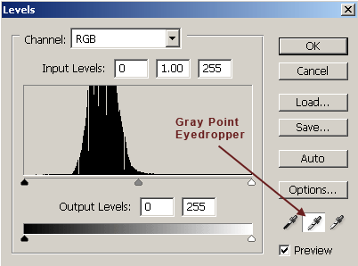 Video The next step in our image processing is to neutralize the color of the sky background. This means to adjust the color of the sky background so that it is neutral, or close to it, and does not have a color cast. If we use the color sample tool and read the pixel values in the info palette as we move around in the sky background of the image, the red, green and blue values should all be approximately equal if the sky background is neutral. There will be some variations because of random pixels in the image, but overall, they should be fairly close to each other. If we performed a flat-fielding operation by subtracting a blurred copy of the original as seen in this previous section, the sky background should be neutral and this step does not have to be performed on the image. If we have not performed this flat-fielding operation, then the color of the sky background will be off and we will have to neutralize it. You may be wondering why the color of the sky background is incorrect if we shot daylight white balance in the camera and then set the white points in the image. This is because digital cameras are sensitive enough to accurately record the true color of the sky if the exposures are long enough. The night sky appears black to our eye at a dark-sky site, but is not black. The sky has color from natural sources such as the airglow, as well as man-made sources such as light pollution. At most observing sites, images will usually record the sky with some color, usually an unpleasant red-brown color. If we want to show the deep-sky objects as they look in their natural state, as if we viewed them from space, we have to neutralize the color of the sky background. Neutralizing the sky background can be accomplished in two different ways. The easiest is to use the gray-point eyedropper in the levels palette. The other method is to set the "black point" in the image. Here we will describe how to use the gray-point eyedropper, and in the next section we will tell how to neutralize the sky background by correctly setting the black point. Neutralizing the Color of the Sky Background with the Gray-Point Eyedropper