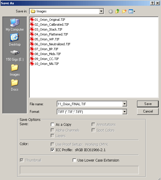 You can see that each step builds upon the previous steps. The number prefix will help you keep track of where you are in the processing steps. You don't have to do each step, and you can name your files accordingly. Of course, this creates a large number of full-resolution files, so you will need a lot of disk space to store them. After processing an image, I would suggest archiving all of the files: originals, working, and finals, to a CD-ROM. Once you have arrived at a corrected and enhanced final image that you are satisfied with, then be sure to save a copy of it at full resolution as an uncompressed TIFF file. This will be your master final image. You should also write protect this file. Save the adjusted image as uncompressed TIFF file. Give it a new file name and do not overwrite the original.