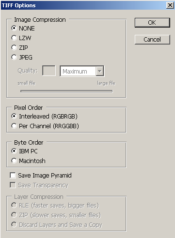 If TIFF is selected, chose None for Image Compression, Interleaved for Pixel Order, and IBM PC for Byte Order. Do not check on Save Image Pyramid.