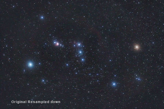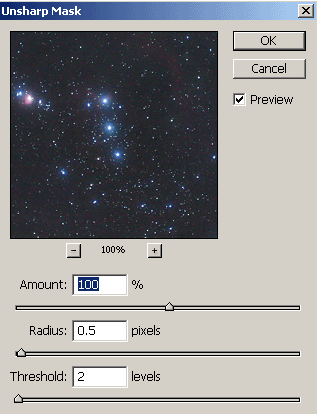 Video In-Camera Sharpening DSLR cameras have a low-pass blurring filter in front of the sensor to deal with the problems of moire and aliasing. Because of this, and because of the blurring effect of the atmosphere during long exposures, the images produced by these cameras must be sharpened. Only specially modified DSLR cameras have this filter removed. Even images produced by modified cameras must be sharpened because of the sharpness lost to seeing effects. JPEG images are usually sharpened in the camera when the image is processed and before the JPEG file is written to the storage card. The amount of in-camera sharpening for a JPEG image can usually be controlled via menu settings. Sometimes it can even be turned off completely which can help with the noise in images shot at extremely high ISO settings such as ISO 3200. If you are shooting JPEG images in the camera, I recommend that you experiment with different in-camera sharpening settings to find the setting that works best for your images. This will usually be a compromise between the amount of sharpening and the amount of noise present based on the temperature and ISO. Sharpening, whether in-camera, or in later processing will make the noise in an image appear worse if not done carefully. A Two-Pass Approach It is generally recommended that a two-pass approach to sharpening be applied to DSLR camera images. The first pass can either be in-camera sharpening of the JPEG image, or if sharpening is turned off in the camera, an unsharp mask can be applied in Photoshop. This initial round of sharpening gets the sharpness back that was lost due to the low-pass anti-aliasing filter built into the camera. The second step of sharpening is not performed until the specific type of output is known. Different output types require different amounts of sharpening. The amount of sharpening will depend on the content of the picture, it's original sharpness from focus, seeing, etc. the amount of cropping and enlargement, and the size it will be printed at. Generally, for images with a lot of noise in them, or JPEGs in the camera, it's not a good idea to apply any sharpening at all to them. The better the signal-to-noise ratio in the image, the more sharpening can be applied. For most deep-sky images, it is better to be a little subtle with the sharpening and apply less than you would for a normal daytime image. Resampling The original image out of a DSLR camera will usually be many millions of pixels in size. This large file size contains the full optical resolution of the sensor in the DSLR camera. The Canon 20D for example, has a 3504 x 2336 pixel image that contains 8,185,344 pixels and creates a 23.4 megabyte file. This full resolution file is the one that we want to correct and enhance because it contains all of the original data from the camera. It is perfect for making large prints. However, it is much too large to display on a web page or to send in an email. For these uses, we must resize, or resample the image. Resizing or resampling an image means to change the number of pixels in the image and its file size. This is usually done with a fairly sophisticated mathematical algorithm in an image processing program like Photoshop, using a method like Bicubic interpolation. This algorithm examines each pixel in the image and its neighbors, and discards groups of them as it creates a new pixel based on the data it has examined. The bicubic resampling algorithm usually works very well for photographic images. To resample an image in Photoshop, go to: Image > Image Size. Note the file size for the original image is given at the top of the dialog box, and the dimensions of the image in pixels is given in the width and height boxes.