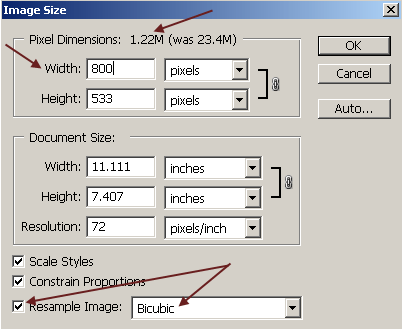 Now change the width or height box and the file size next to Pixel Dimensions will change reflecting the new file size. The original file size will be displayed next to it. If the Constrain Proportions box is checked, changing either the width or height will change the other to keep the proportions of the image exactly constant. For web display or email use, a width of 600 to 800 pixels is usually good for a horizontal image. Once an image is resampled like this to change its size, it usually loses some sharpness however. This sharpness can be regained by use of Photoshop's Unsharp Mask Filter. Photoshop's Unsharp Mask Filter Photoshop offers several different options under the Filter > Sharpen menu. The one that we will use, because it gives the most control, is the unsharp mask. The name sounds contradictory, but it works.