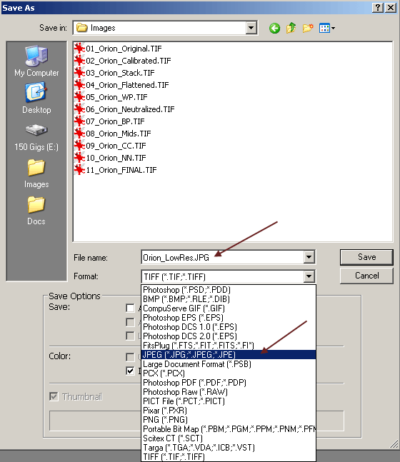 For the initial sharpening, try an amount of 100 to 300 percent, and a radius of 0.3 to 0.5 pixels. The Threshold should be set somewhere between 1 and 4 levels. The unsharp mask filter acts by sharpening edges in an image. The amount slider specifies how much sharpening is applied. The radius determines the number of pixels surrounding the edge pixels that affect the sharpening. The threshold specifies how different the sharpened pixels must be from the surrounding area before they are considered edge pixels and sharpened by the filter. Some experimentation will be necessary to determine the optimum amount of sharpening needed by Photoshop unsharp mask filter. A balance needs to be struck between the amount of noise present in the final processed image and the amount of sharpening that can be applied because sharpening usually makes the noise appear worse. More sharpening can be applied to low-noise images. Photoshop CS2 also offers a new "Smart Sharpen" filter, which gives more control over the unsharp-mask filter. It allows independent controls over how much sharpening is applied to the shadows and highlights. This is a very useful feature to prevent aggravation of the noise in the shadow areas. Save As JPEG Once the image has been resampled and sharpened, it can now be saved as a JPEG file format image for web display or for emailing to friends. This compressed file format does throw away some data to achieve high compression ratios, but it does a really good job of it. If done correctly, the loss should be hardly noticeable visually.