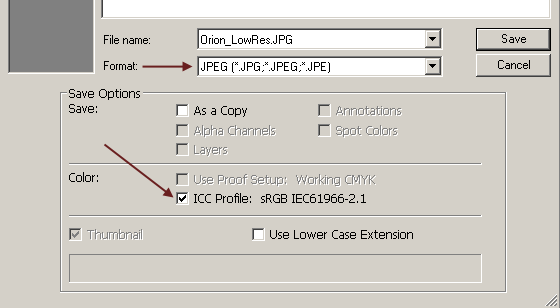 Make sure the box is checked next to ICC Profile so that the correct color space tag is embedded in the file.