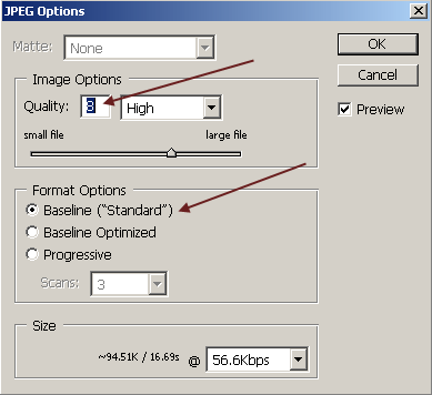 The compression ratio is a compromise between file size and quality. A high compression ratio yields a small file size, but a poor quality image. I usually use a high quality setting around an 8 that gives good quality and a reasonable file size. Make sure that Baseline ("Standard") is checked under format options. |