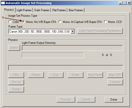 1. Under Automatic Image Set Processing > Process Tab under Image Set Process Type Select Mono, No WB Bayer CFA.