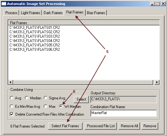 Highlight all of the flat-field frames to be used and click to Open button in the Select Flat-Field Frames Dialog box. They should then be listed under the Flat-Field Frames tab.