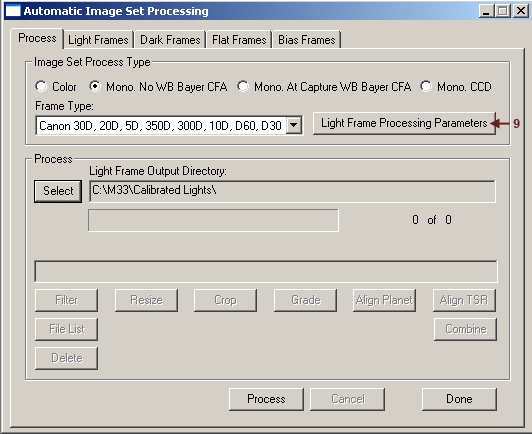9. Under the Process Tab click the Light Frame Processing Parameters button. A new dialog box for Auto Process Parameters will appear.