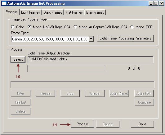 11. Click the process button to automatically calibrate the light frames.