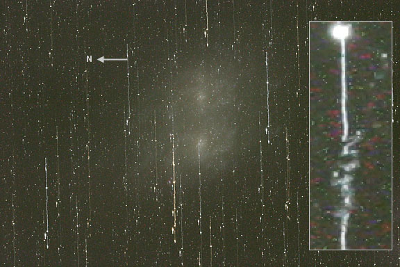 Video Check each frame for accuracy of focus and tracking. You would be surprised at the number of different things that can go wrong in a long-exposure deep-sky astrophoto. Look for planes and satellites that may have flown across the frame during the exposure for the sub-frame. If an individual exposure is sub-standard it should not be included in the master light frame as this will degrade the final image. I always shoot raw files and JPEG concurrently. That way, the JPEG is processed in camera, and I can examine it immediately to see if there is anything wrong with it. If there is, it will also be wrong in the raw file and it can easily be discarded. If you only shoot raw files, you can save some disk space, but you will have to apply a stretch to the raw files to examine them before processing. This is not difficult, but it's a little bit quicker and easier to examine the JPEGs for problems. Also, I can very easily access the EXIF exposure data that is embedded in the file with a simple little freeware program called EXIF Reader. I simply put a shortcut to EXIF Reader on the Send To menu and then in Windows Explorer I can right click on a JPEG file and send it to the program and immediately see the exposure time, ISO and other data. You can also see this info in the raw file, but you need to open a more complicated program like Canon's EOS viewer utility. It's almost hard to believe that all of the following examples could have gone wrong in a single imaging session all on the same night. Some I have explanations for, some are common, and one I have to guess at its cause.