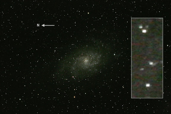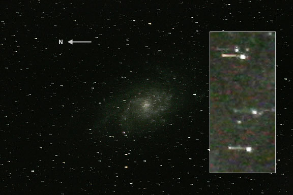 Image 1 is an interesting example of what can go wrong to ruin an exposure. Trailing in right ascension, or the east-west direction is not unusual in exposures that are unguided, although it is usually less than about 30 arcseconds or 1 arc minute and it is usually due to periodic error in the right ascension gear. In this case, the 10 minute exposure was guided with an ST-4 autoguider, so periodic error should have been corrected, and would not have been on this scale. I think what happened was that the voltage on the battery must have dropped down to just about the level where the telescope drive would not work. Perhaps it just stopped guiding for a while and then started up again. I do remember having problems with the deep-cycle battery that night because I don't think I charged it adequately enough during the day after a full night's use the night before. As far as the strange zig-zag of the trail seen in the inserted enlargement in Image 1, who knows what happened there. Because part of the pattern is smeared so badly, I am inclined to believe that this is simply incredibly bad seeing, possibly caused by the wake of a jet aircraft that passed very nearby to M33.