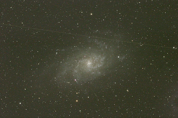 Image 5 shows a trail from a Earth-orbiting satellite that passed through the frame during the exposure. Because the image was taken at 4:45 am in the morning with dawn approaching, satellites in high orbit can be in the sunshine even though it is still night on the ground. These satellites are illuminated by direct sunlight and can be bright enough to be visible to the unaided eye, and also can be recorded by our DSLR cameras. Out of 14 good frames that I had of M33, two shot early in the morning have satellite trails in them. These two frames can be included in the stack if the images are median combined, and the trails will not show up in the final image. |