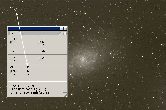 3. Set a color sample point in an empty section of the sky background of the image that does not contain any stars or nebulosity. Notice that the R,G,B readouts for this point in the image are 64,57,43. This indicates that the sky background is higher in the red and green compared to blue. Red and green yield the ugly color of the sky background in this image.